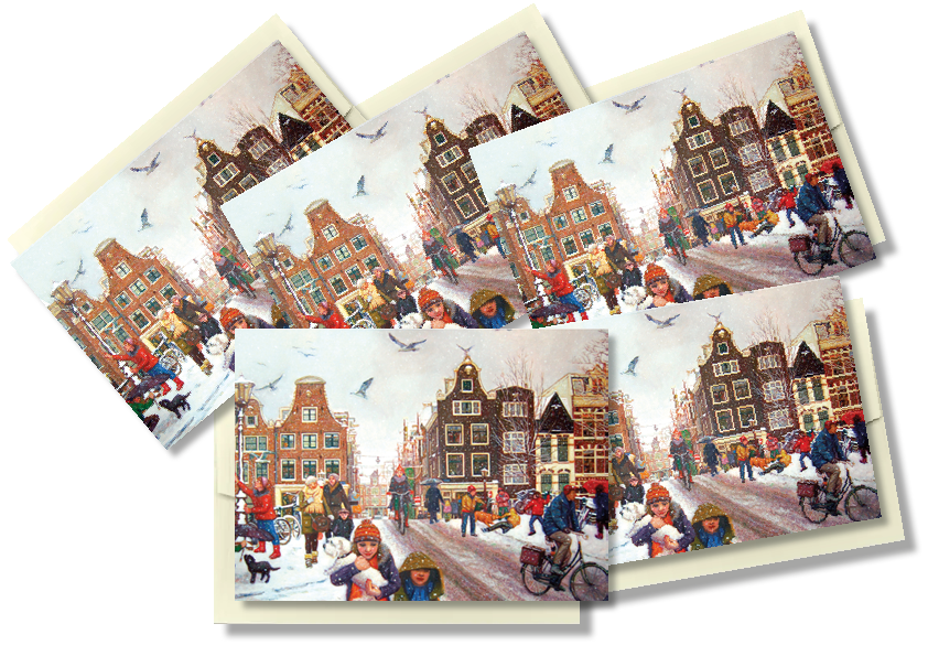 Breng een vleugje Amsterdamse wintermagie in huis met deze prachtige kaarten. Sneeuwpret op de brug met vrolijke figuurtjes: een sfeervol tafereel dat iedereen laat glimlachen. Perfect om te versturen, cadeau te geven of zelf in te lijsten.