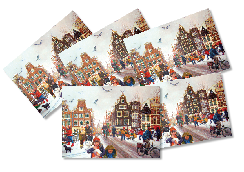 Breng een vleugje Amsterdamse wintermagie in huis met deze prachtige kaarten. Sneeuwpret op de brug met vrolijke figuurtjes: een sfeervol tafereel dat iedereen laat glimlachen. Perfect om te versturen, cadeau te geven of zelf in te lijsten.